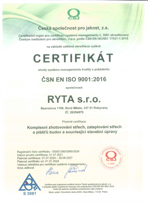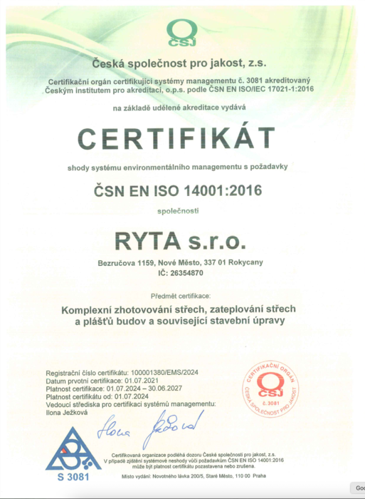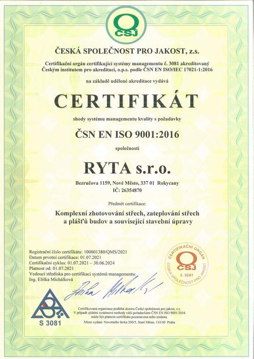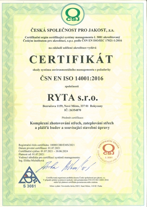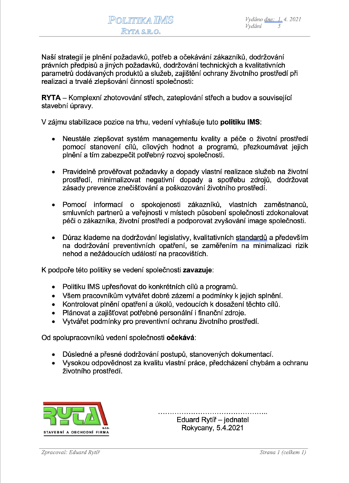 Společnost RYTA s.r.o. má zavedený integrovaný systém managementu, certifikovaný dle norem ISO 9001 a ISO 14001. Tento systém nám pomáhá zajišťovat kvalitu služeb, odpovědný přístup k životnímu prostředí a plnění legislativních požadavků. V rámci tohoto přístupu jsme se zavázali k neustálému zlepšování, bezpečnému provádění prací a šetrnému zacházení s přírodními zdroji. Zásady a závazky vyplývající z tohoto systému shrnuje naše veřejně dostupná Politika IMS.