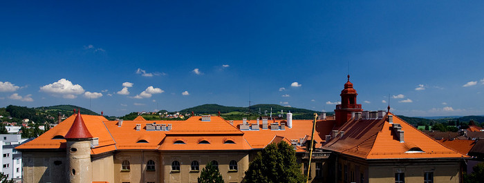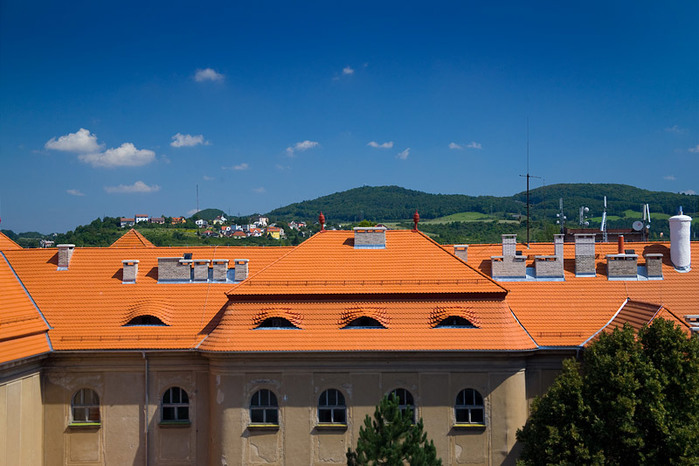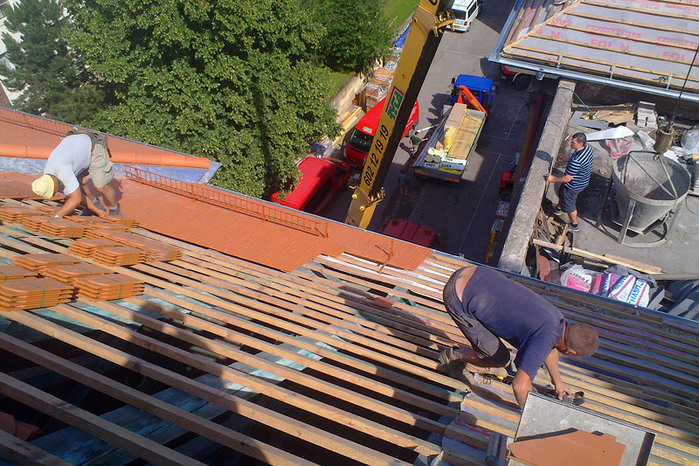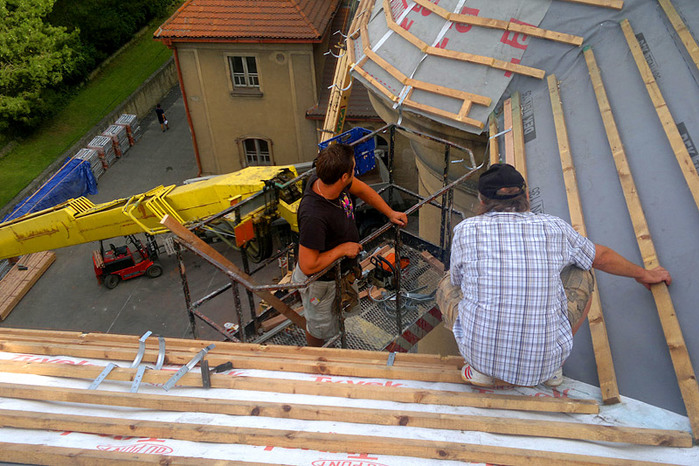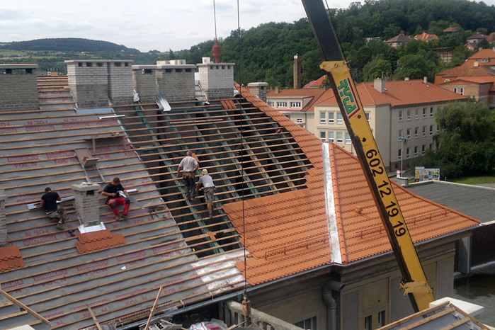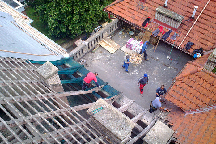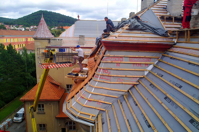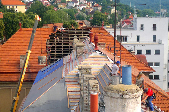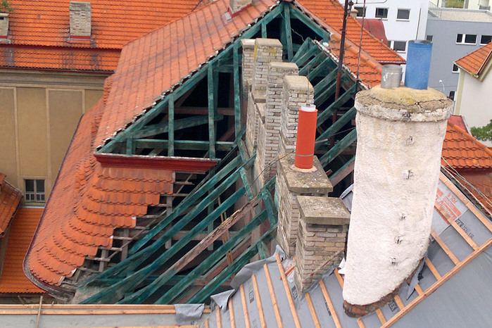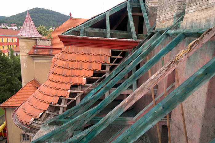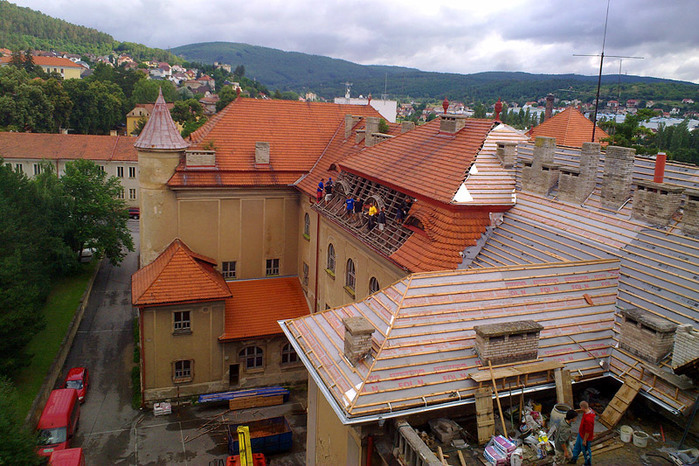 Během letních prázdnin jsme ve velmi krátkém časovém termínu pouhých 50 dní, provedli rozsáhlou rekonstrukci střešního pláště a komínových těles, opravu poškozeného krovu, montáž nových klempířských prvků a nátěr dvou věžiček. Některé prvky krovu byly v havarijním stavu a muselo dojít k výměně, poté se celá konstrukce ošetřila, proti dřevokazným škůdcům a houbám.