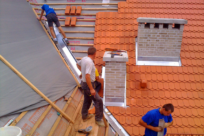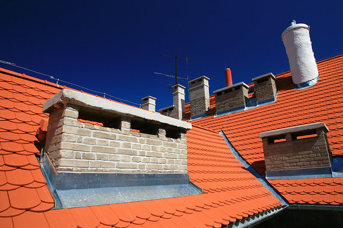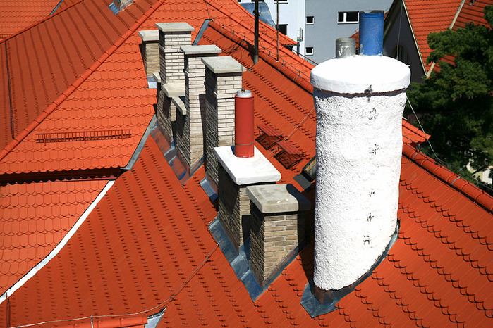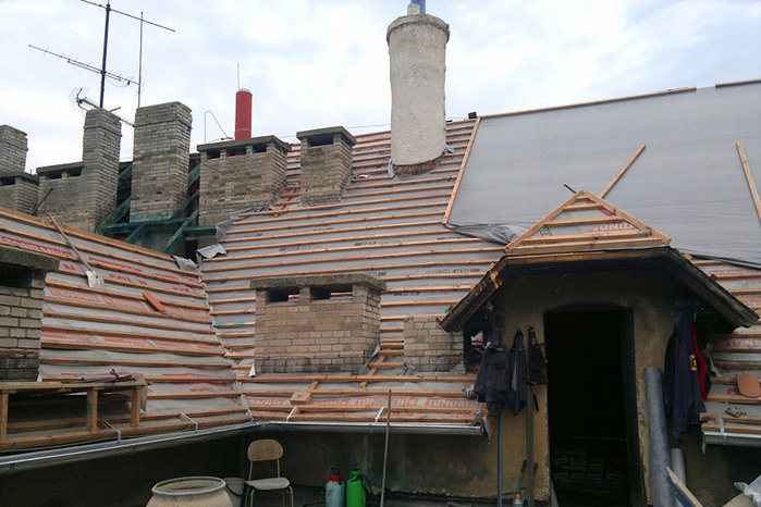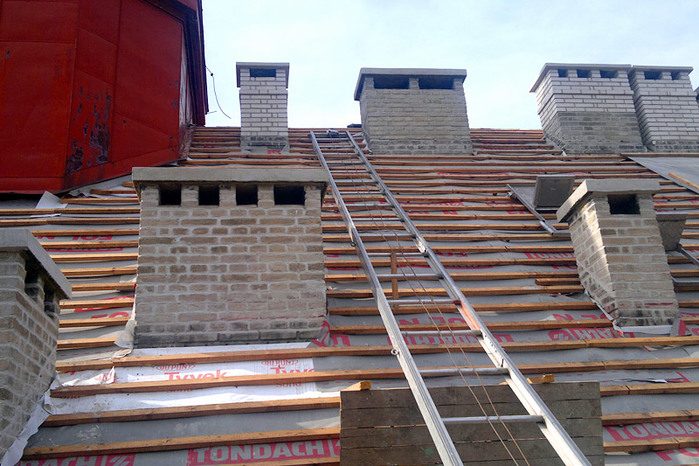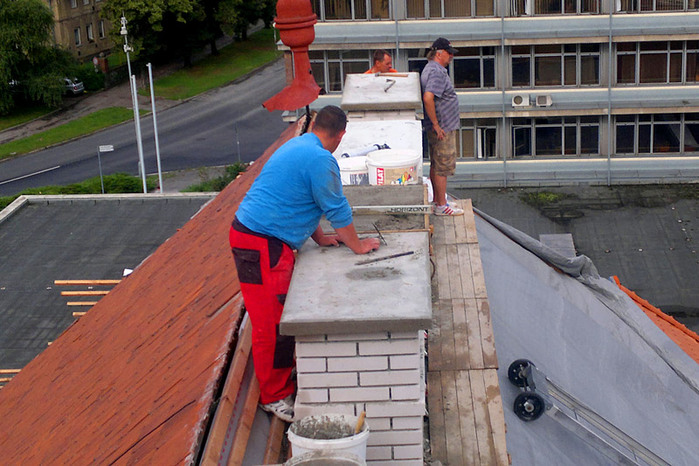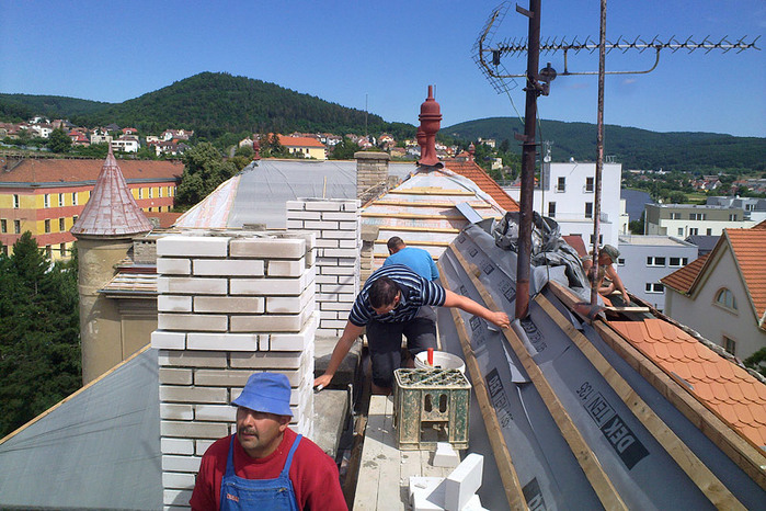 Komíny, ve špatném stavu byly ubourány a nově vyzděny, u zbylých komínů byla provedena pouze oprava. Nový střešní plášť je proveden z červených bobrovek Tondach v celkové ploše 2570 m2.