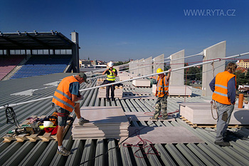 V podzimních měsících jsme se podíleli na části výstavby nové fotbalové DOOSAN Arény ve Štruncových sadech v Plzni. Firma Ryta s.r.o na této stavbě zprostředkovávala pokládku střešního pláště v rozsahu 6.000 m2. Skladba střešního pláště byla následující. Na připravený trapézový plech jsme namontovali dvě vrstvy sádro vláknitých desek Rigidur, poté byla položena vrstva geotextílie na kterou přišla finální vrstva folie.