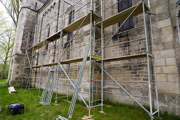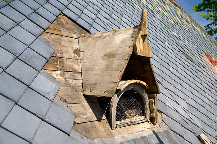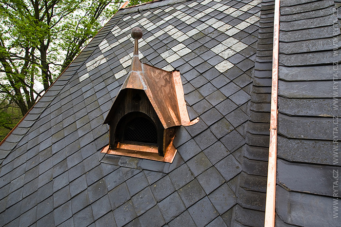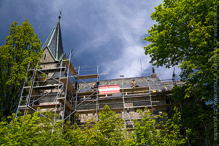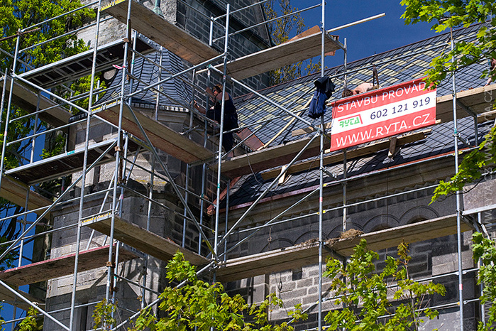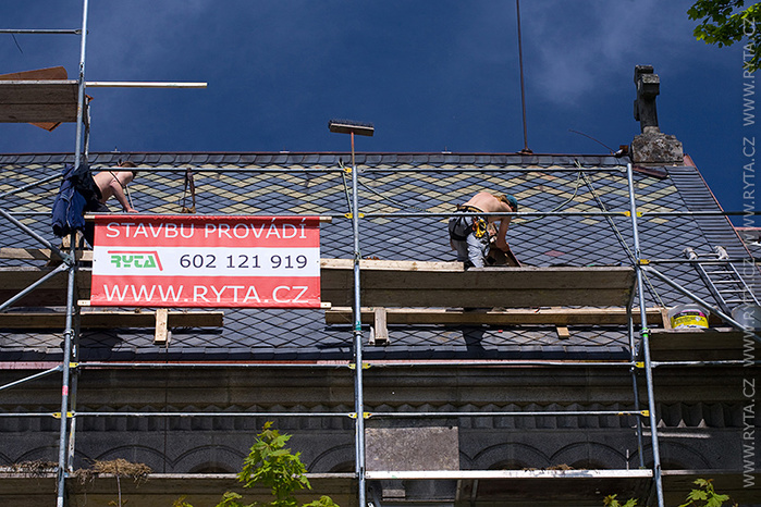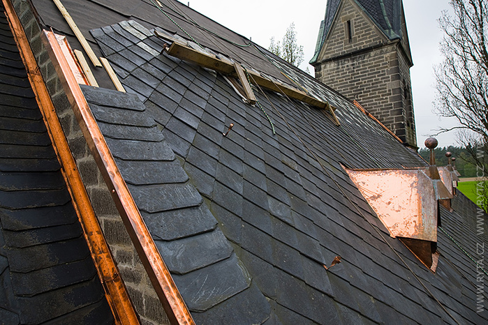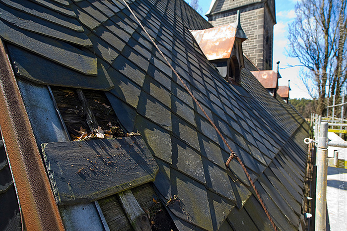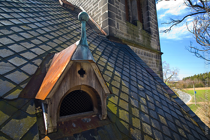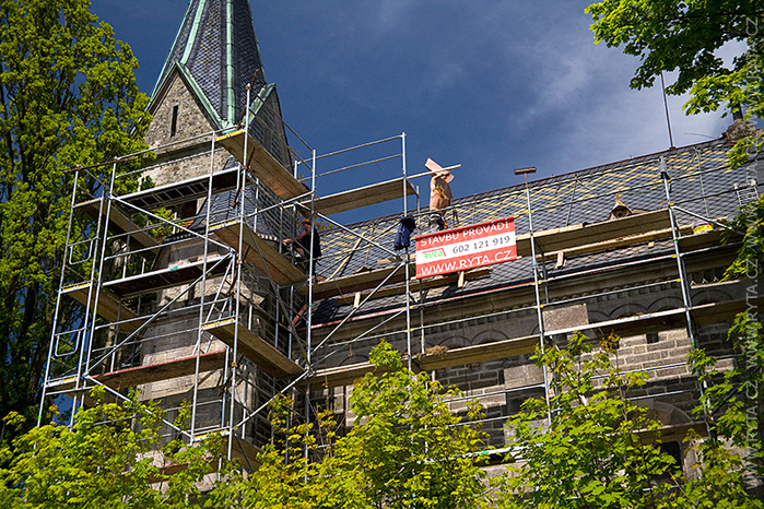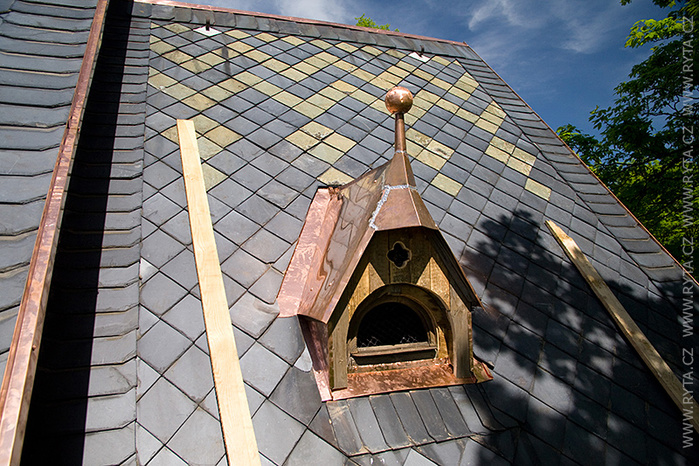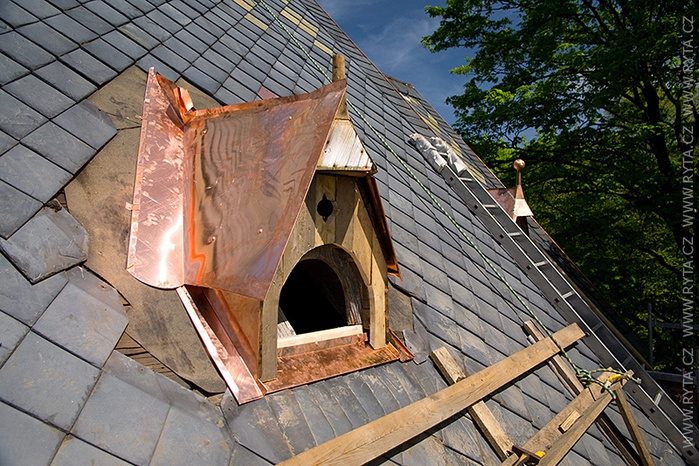 Také břidlicová krytina se pokládala do původních tvarů a obrazců, aby byl zachován vzhled kostela dle dochovaných fotografií.