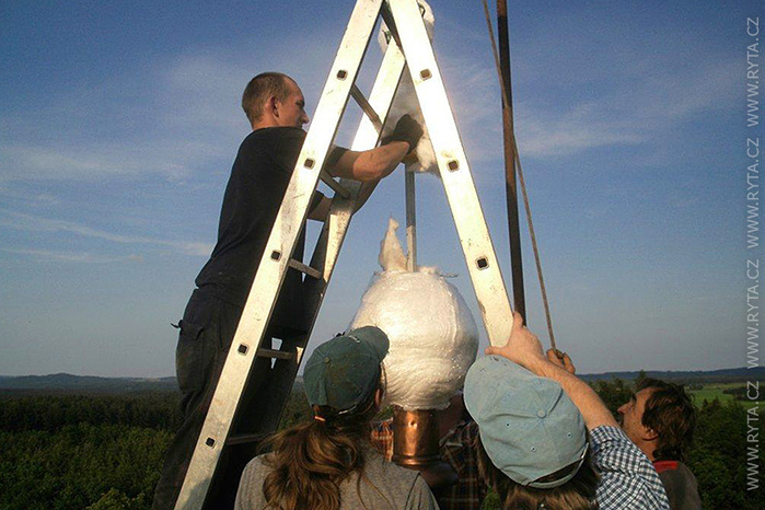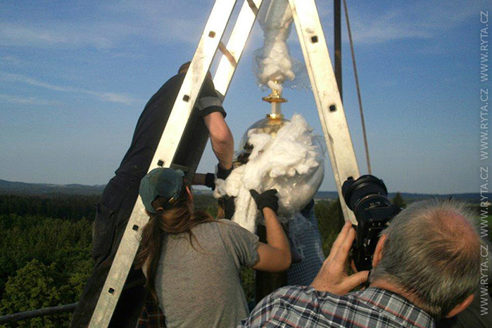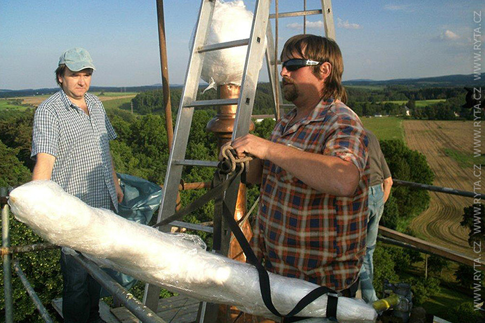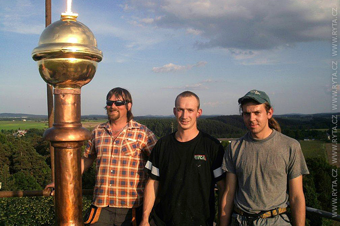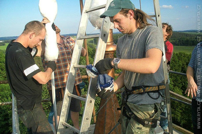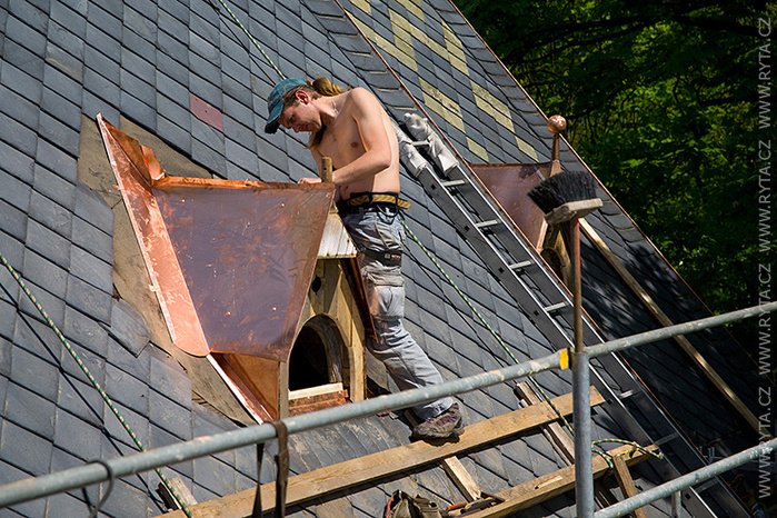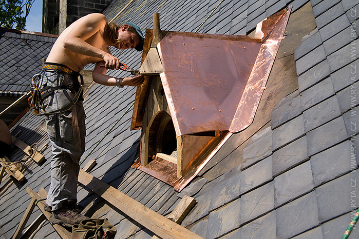 Minulý týden naše společnost ukončila zakázku - výměna střešní břidlicové krytiny a měděných klempířských prvků na kostele Sv.Anny Samétřetí v Pernolci. Jednalo se o poměrně složitou zakázku, veškeré prvky které se měnily, musely kopírovat tvar a rozměry těch původních. Proto veškeré měděné ozdoby se vyráběly ručně přímo na místě, bez použití strojů.
