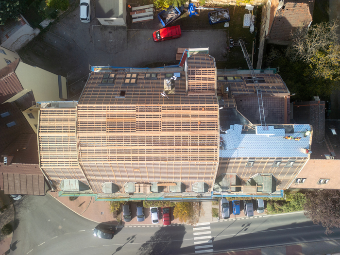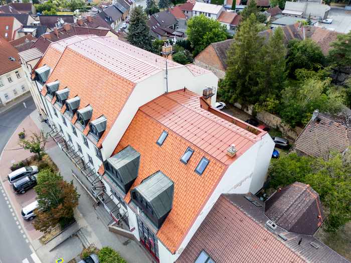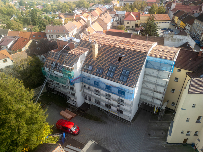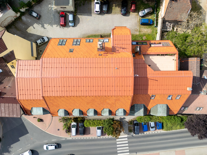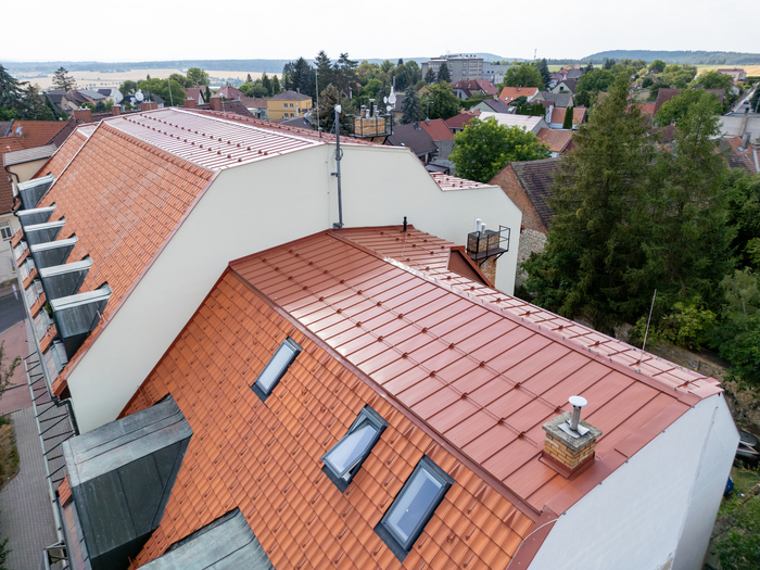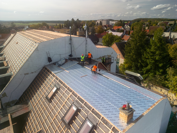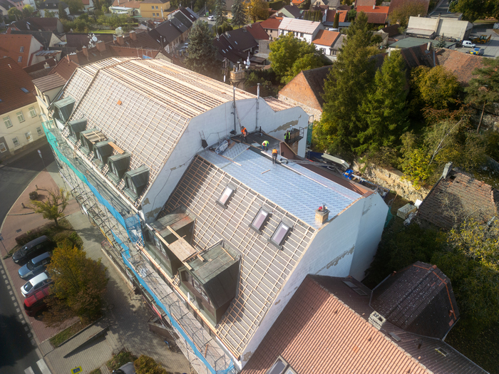 Rekonstrukce střechy Městské knihovny v Novém Strašecí patřila mezi technicky i vizuálně zajímavé projekty, kde jsme kladli důraz nejen na kvalitu provedení, ale i na zachování architektonického charakteru budovy. Jednalo se o mansardovou střechu, která byla kompletně obnovena s využitím tradičních pálených tašek a plechové krytiny. Stavební práce zahrnovaly odstranění staré krytiny, důkladnou revizi a opravu nosných částí krovu, montáž nového izolačního systému a následnou pokládku nové střešní krytiny. Při realizaci byly použity materiály s důrazem na dlouhou životnost, funkčnost i estetický dojem.