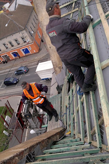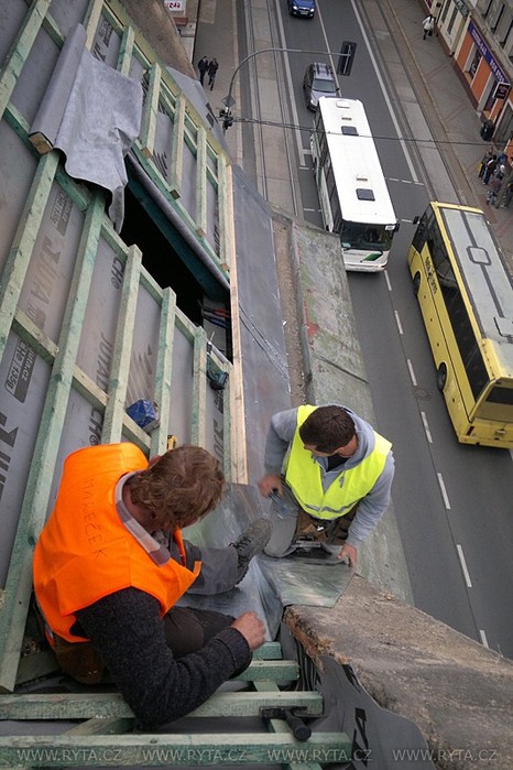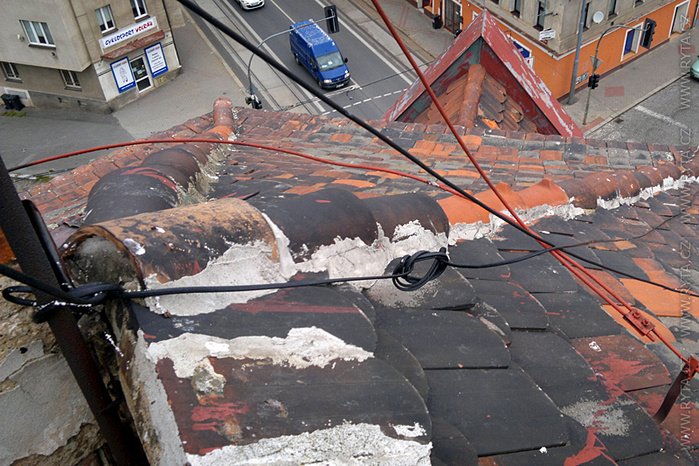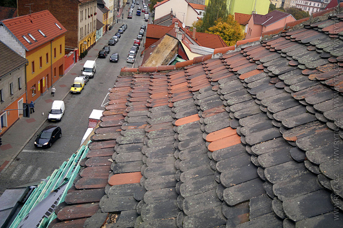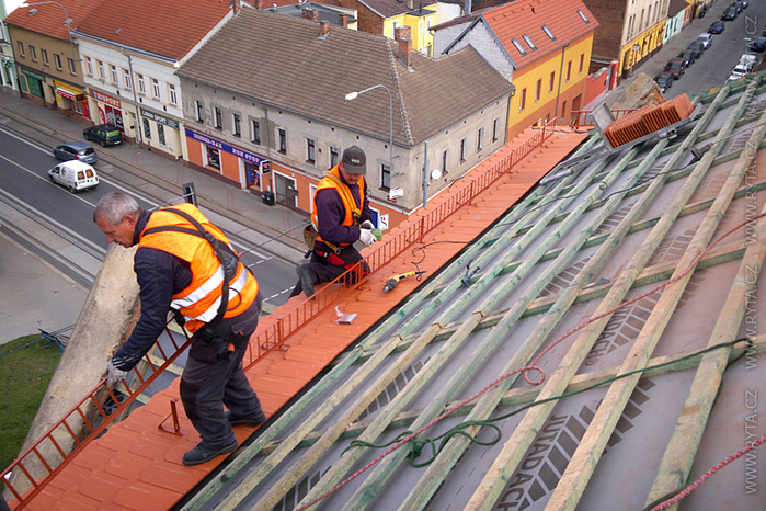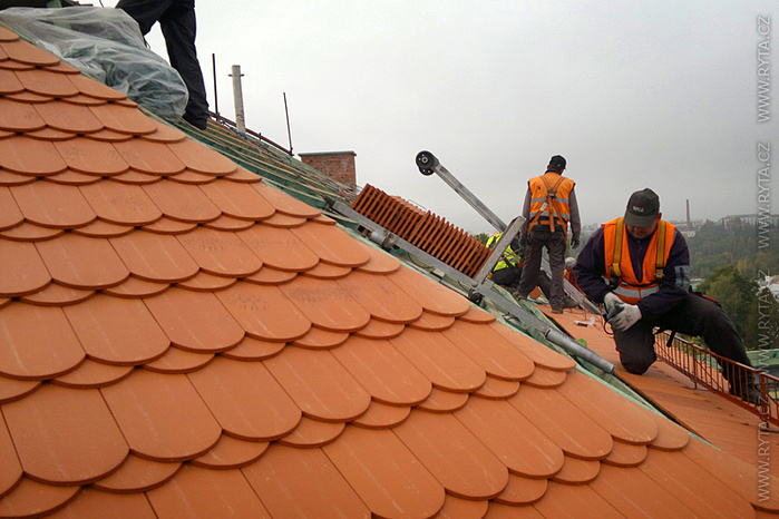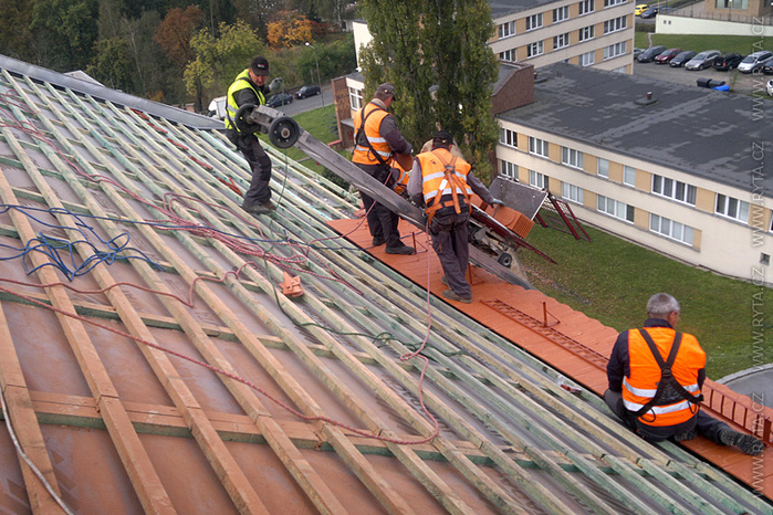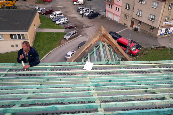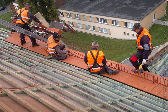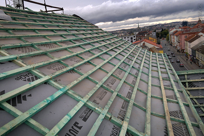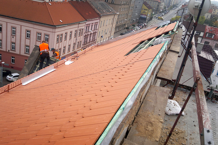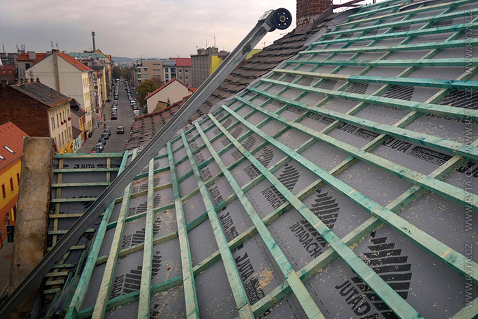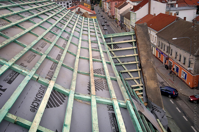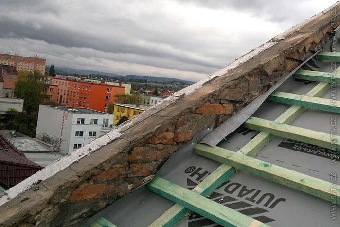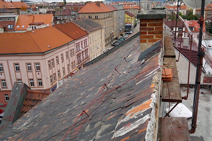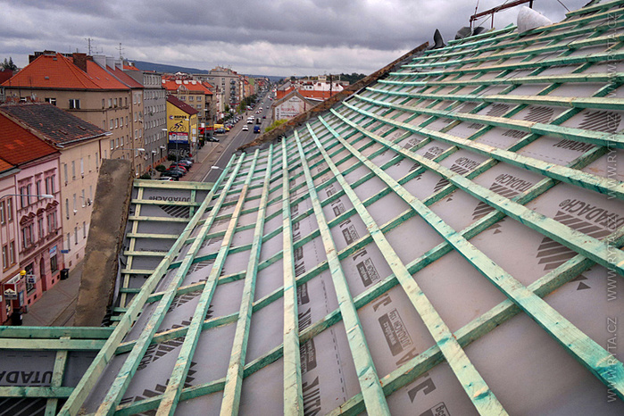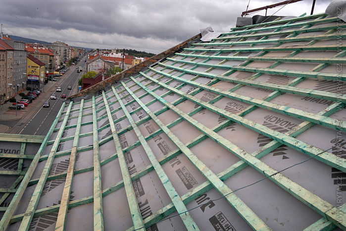 Na bytovém domě Slovanská 40 v Plzni proběhla kompletní výměna střešní krytiny včetně laťování a dále byli vyměněny některé tesařské prvky, které byly v havarijním stavu. Stávající krytina a laťování jsme demontovali a provedli kontrolu krovové konstrukce. Po výměně poškozených prvků byla celá konstrukce ošetřena nástřikem Bochemit QB.