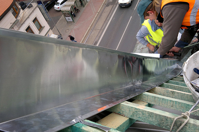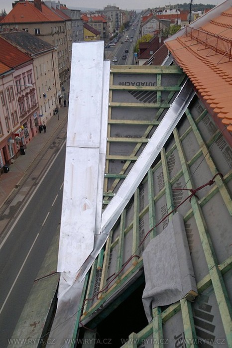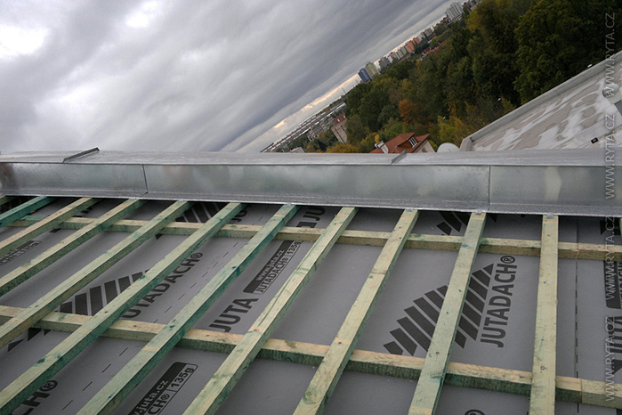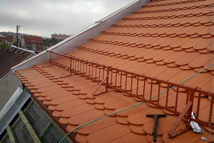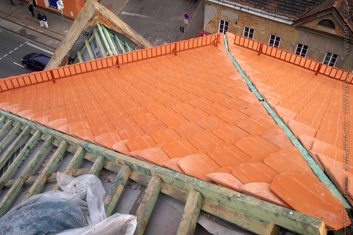 Na naimpregnovanou konstrukci jsme namontovali laťování se střešní folií a na laťování byla požita střešní krytina Tondach Bobrovka. Byla také provedena kompletní výměna klempířských prvků, které byli nově vyrobeny z Ti Zn.