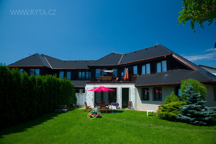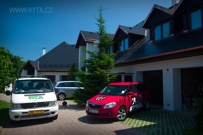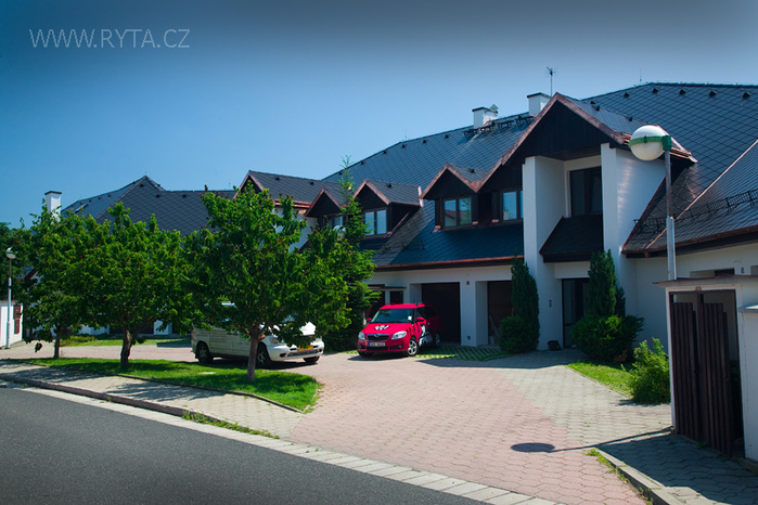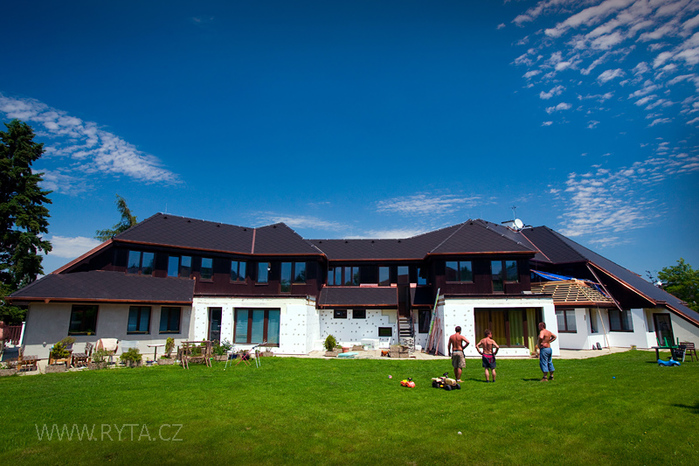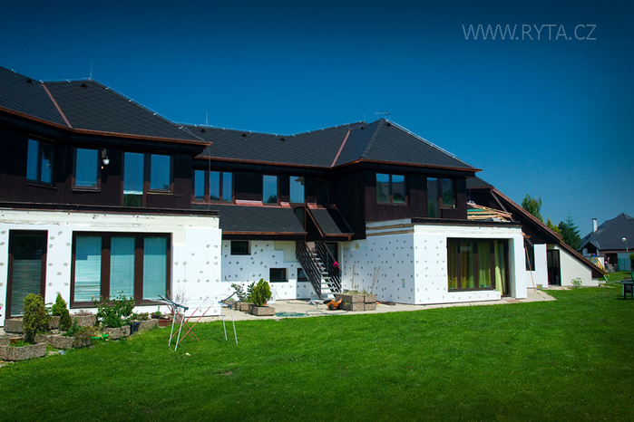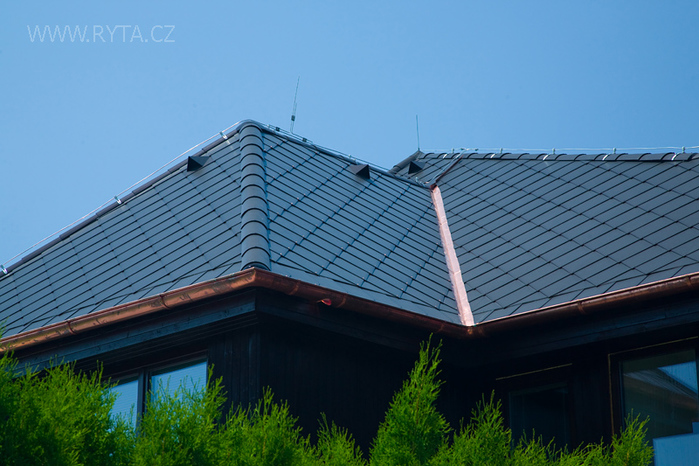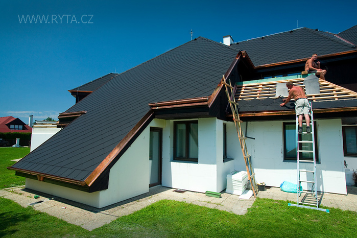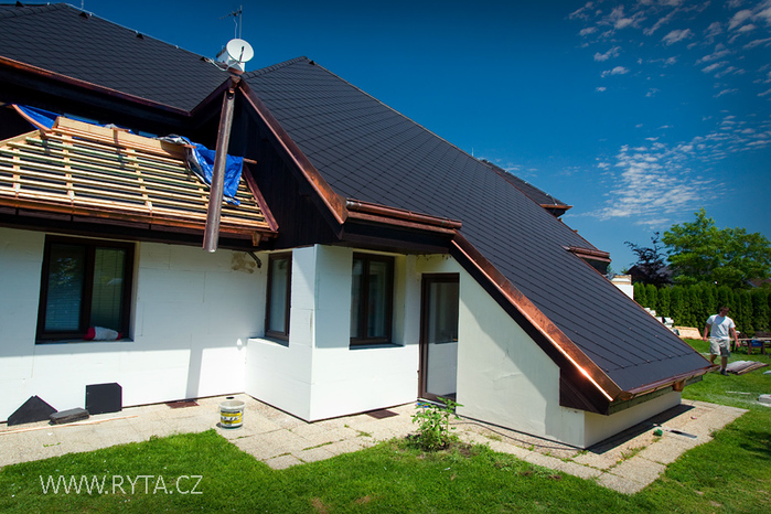 Koncem měsíce června byla naší společností dokončena celková rekonstrukce střešního pláště řadového domu o čtyřech bytových jednotkách v Praze Průhonicích. Původní krytina byla z asfaltového kanadského šindele na dřevěném bednění a klempířské prvky z pozinkovaného plechu. Střešní plášť ze šindele včetně klempířských prvků byl demontován.