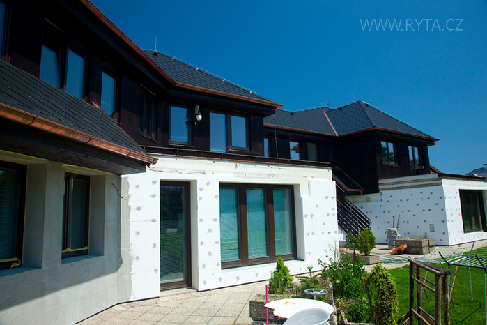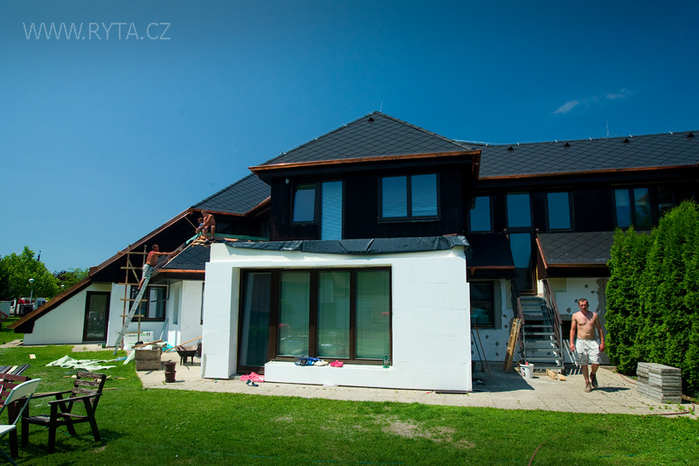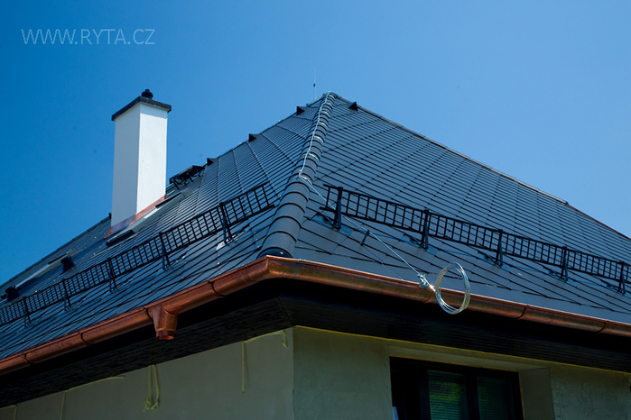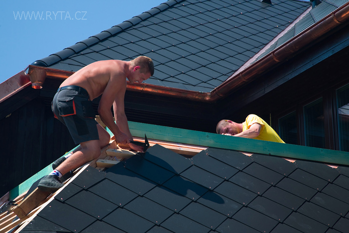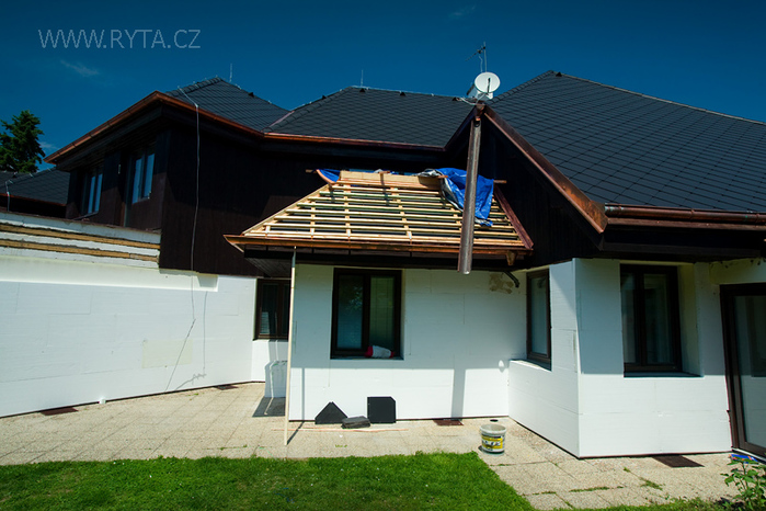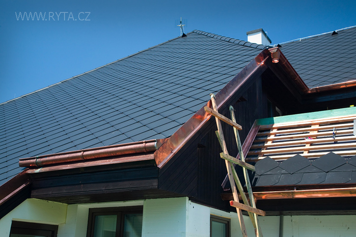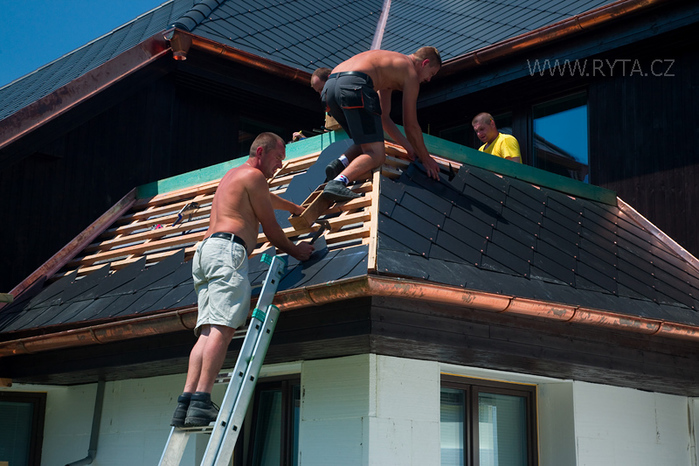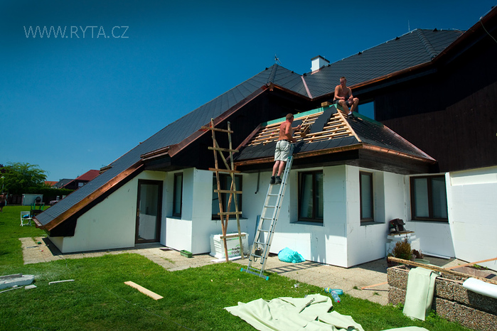 Na očistěný dřevěný záklop se následně položila difuzní kontaktni folie. Na folii byly montovány kontralatě a latě. Jako vrchní krytina byla použita česká šablona Cembrit. Veškeré klempířské prvky byly montovány z měděného plechu. Během provádění prací investor požadoval nad rámec smlouvy o dílo opravu komínů, doplnění střešních výlezů a lávek.