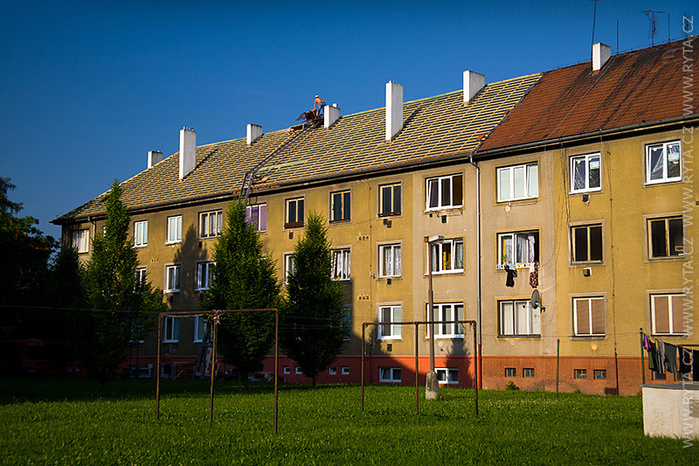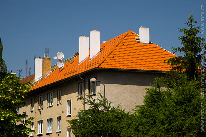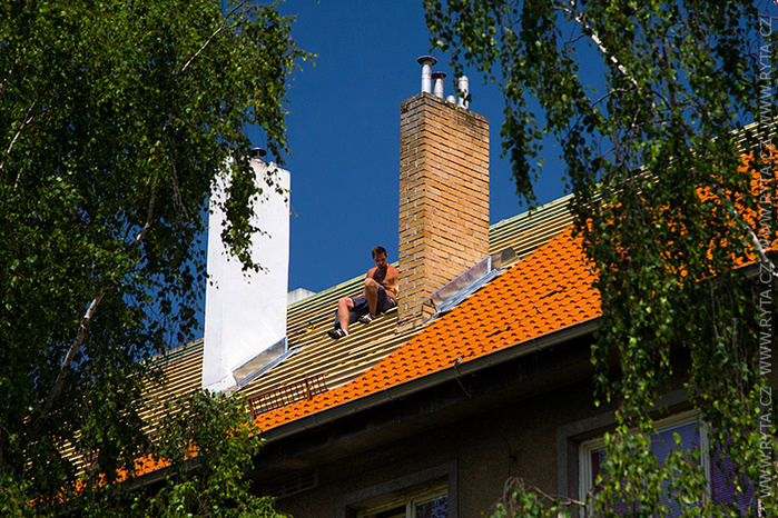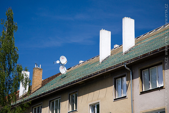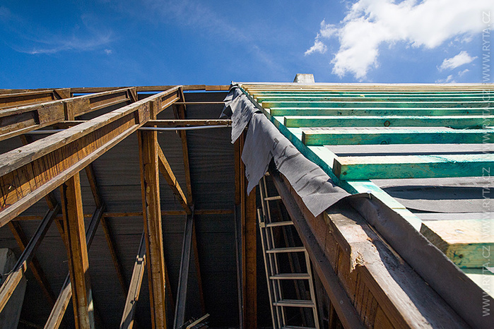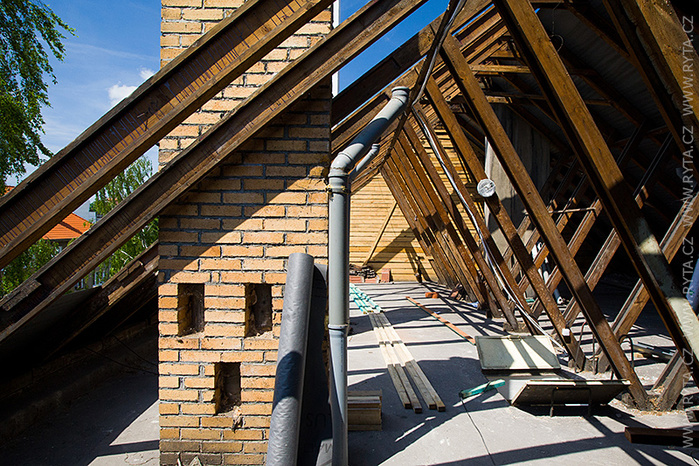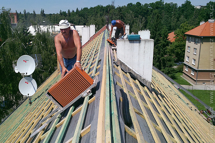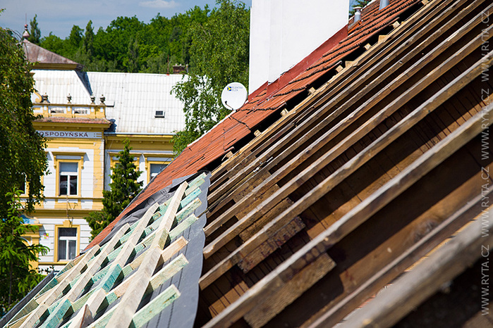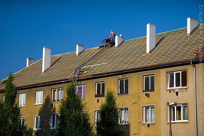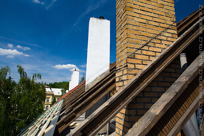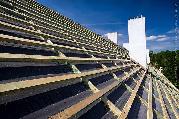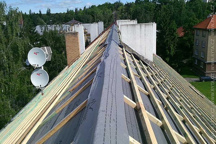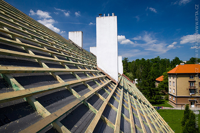 V přelomu května a června jsme provedli rekonstrukci střechy v Raisova 817,818 v Rokycanech. Komínová tělesa a lemování byla již zrekonstruována naší firmou před dvěma lety, tentokrát jsme pouze demontovali starou krytinu s laťováním. Laťování bylo dvojité, latě a kontralatě včetně střešní folie Bramac.
