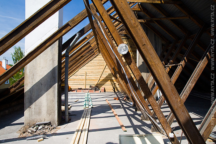 Jako nová krytina byla použita taška Bramac classic v odstínu cihlově červené. Nad vchody a garáž byli namontovány protisněhové mříže a v zadní části budovy protisněhové tašky. Klempířské prvky zůstali původní, byli pouze přizpůsobeny nové krytině.