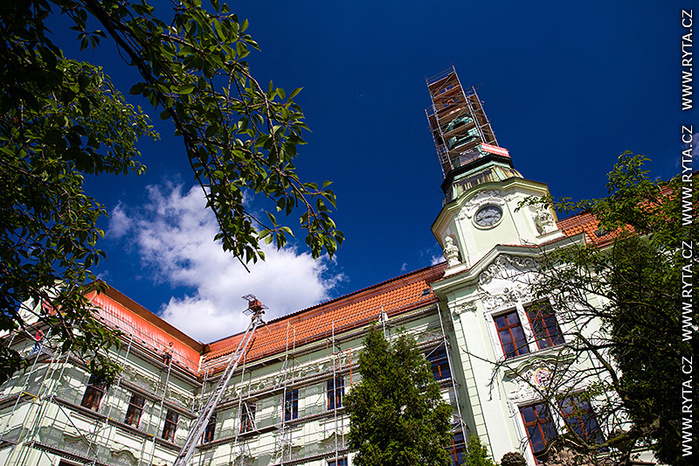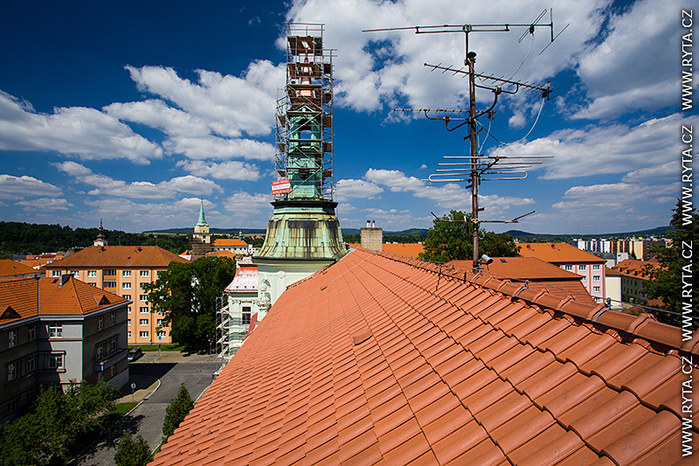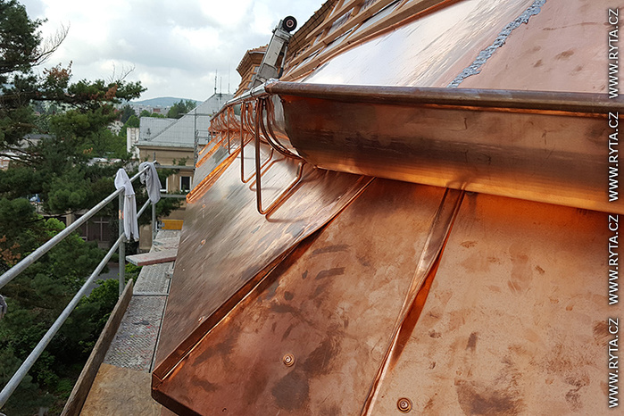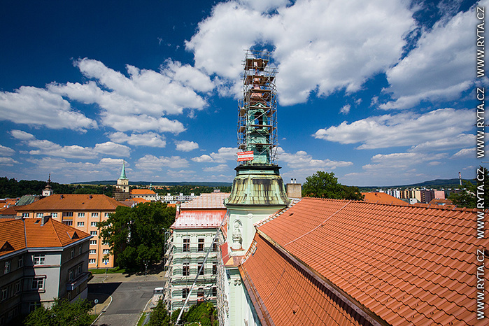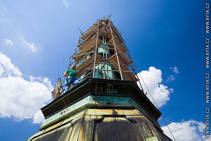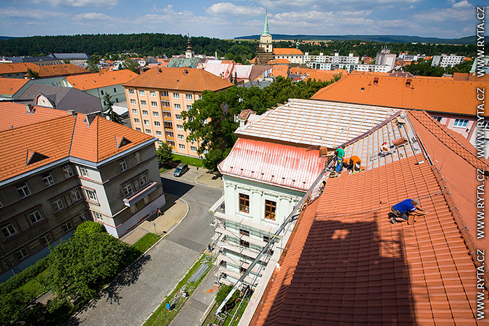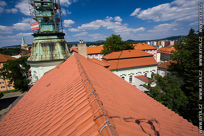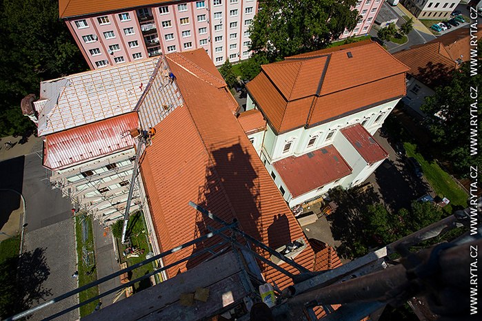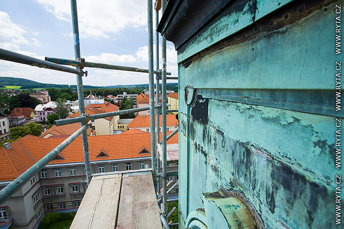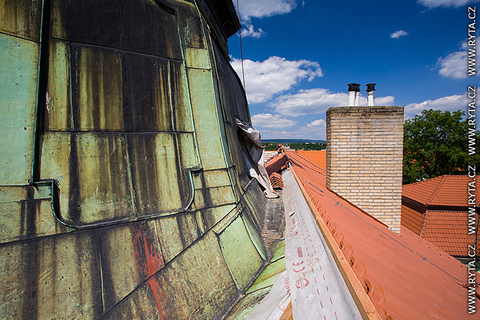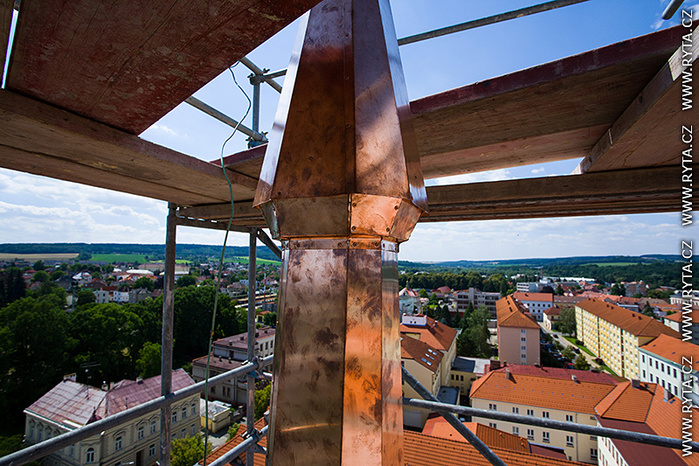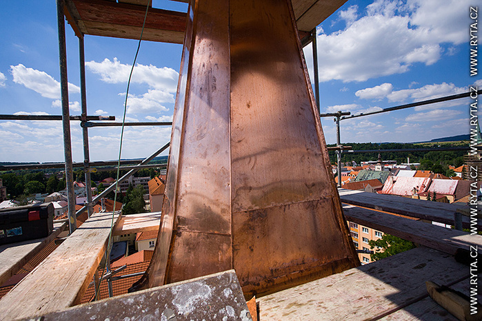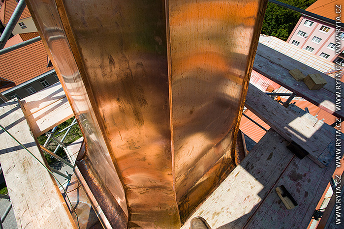 Všechny části krovu prochází důkladnou kontrolou, ty poškozené se repasují, nebo probíhá jejich úplná náhrada a osazení na původní místo. Celkově se jedná pro naše tesaře o řemeslně náročnou práci, neboť zejména v prostoru věže je krov velice složitý a značně poškozený. Také klempířské prvky z mědi musí tvarově odpovídat původnímu originálu. Naší pracovníci je vyrábějí dle dobových fotografií a již demontovaných plechů.