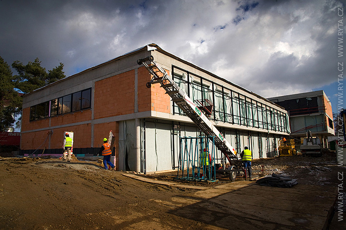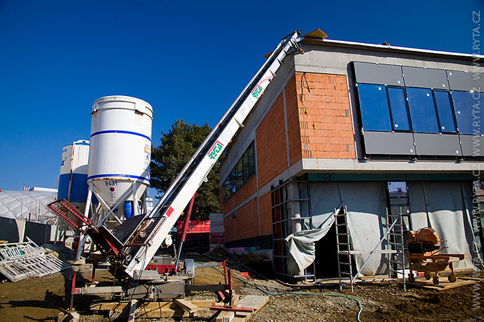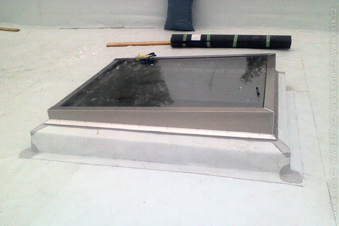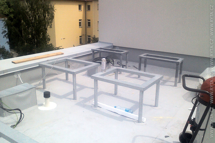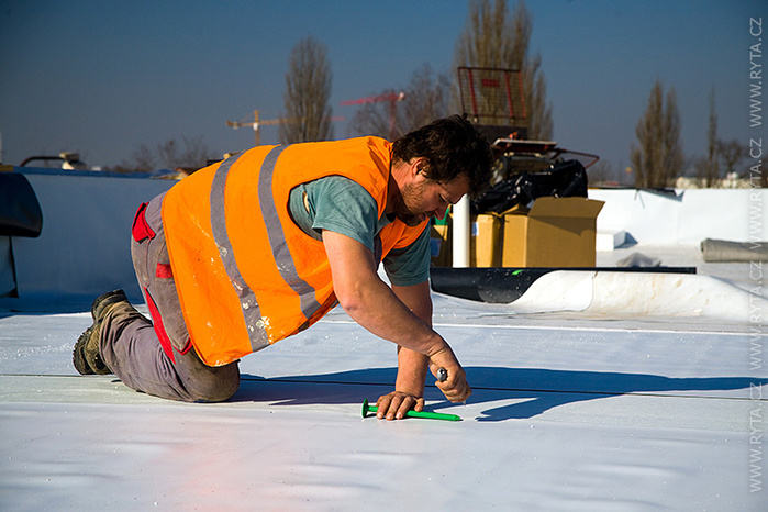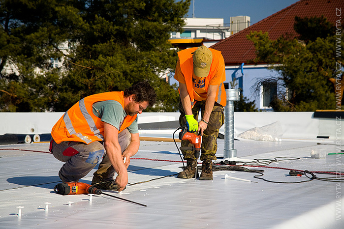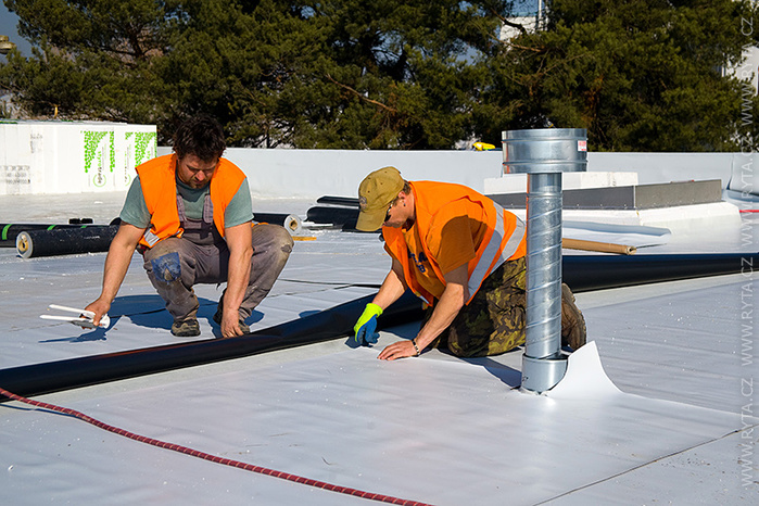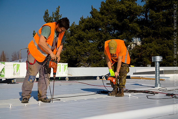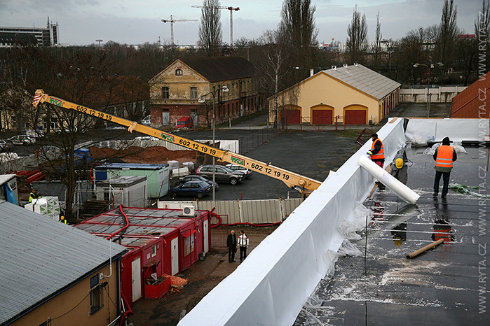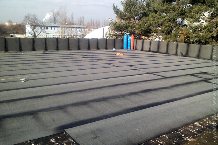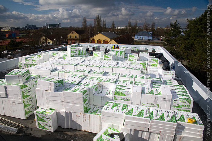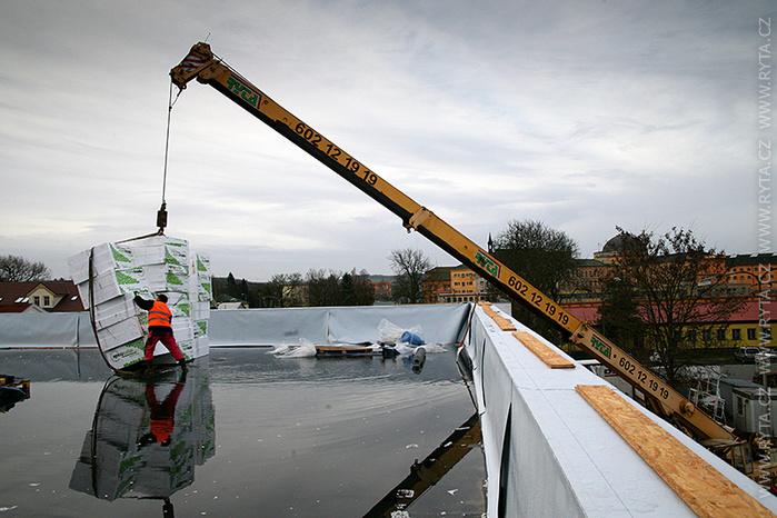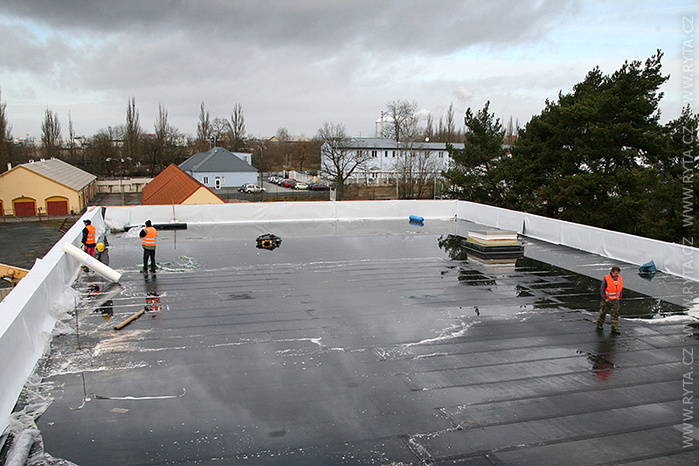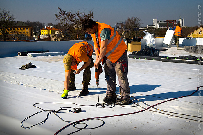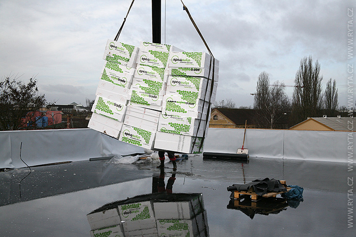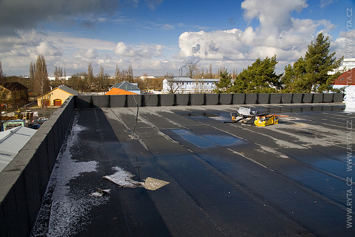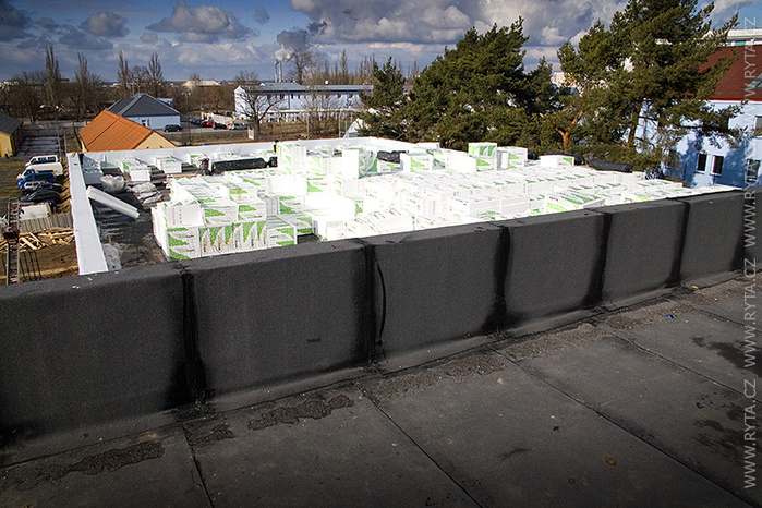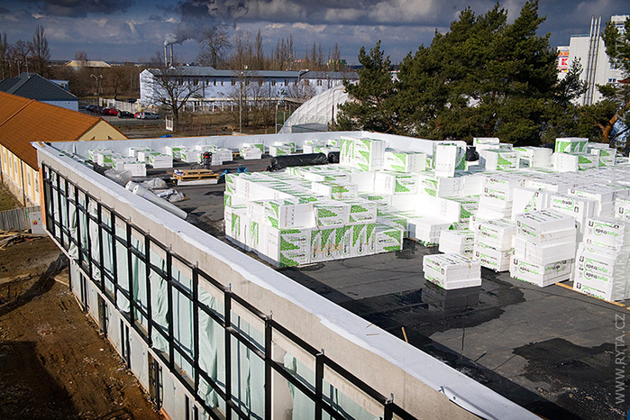 Plocha střechy monolitické betonové konstrukce budovy byla hned v úvodu napenetrována asfaltovým penetračním nátěrem. Poté bylo provedeno natavení parotěsné zábrany na plochu včetně atiky. Dále jsme pokračovali pokládkou první vrstvy polystyrenu tl.20 cm a dále druhé vrstvy v podobě spádových klínů vyspádovaných od 6 cm do 48 cm.