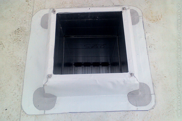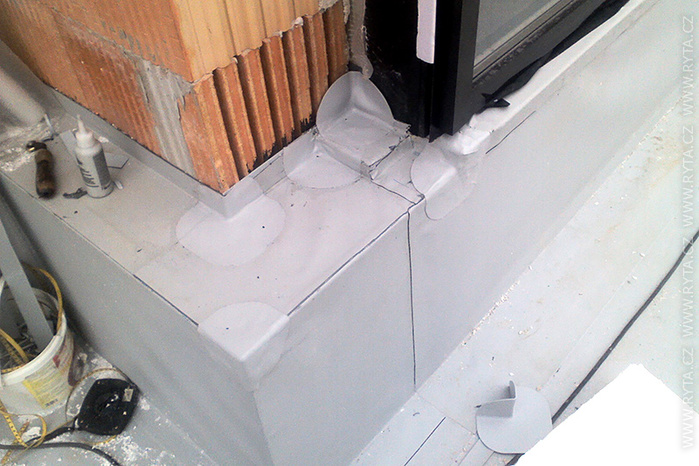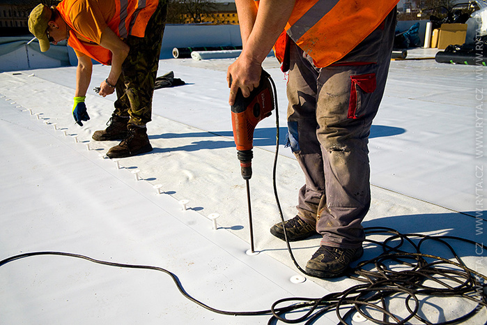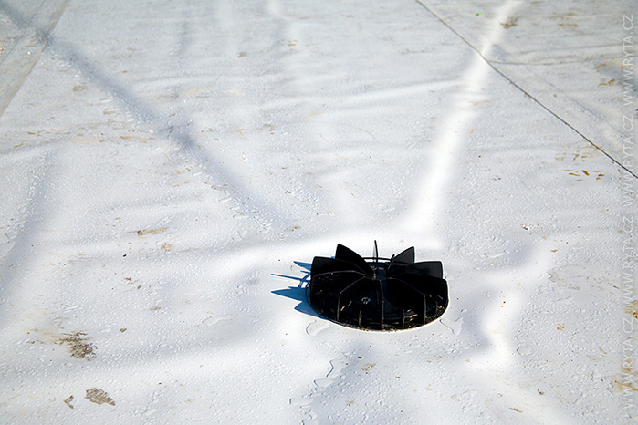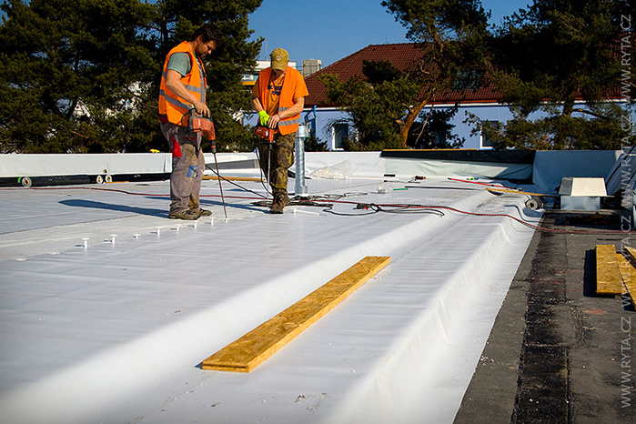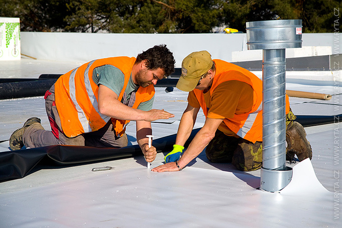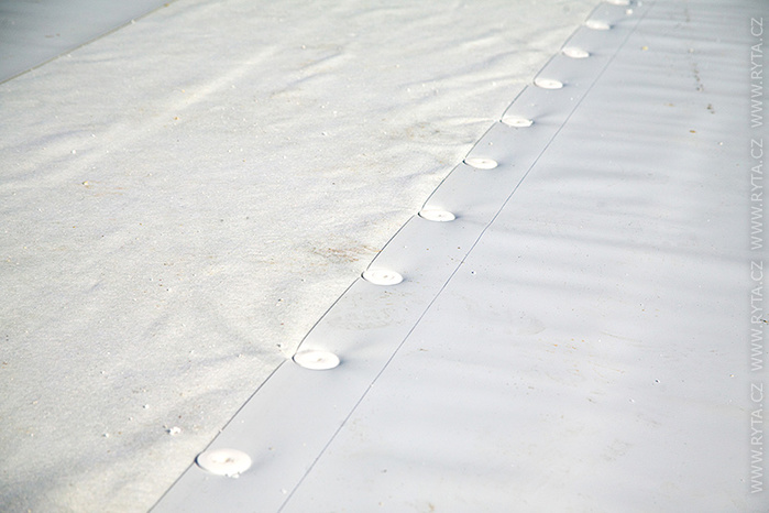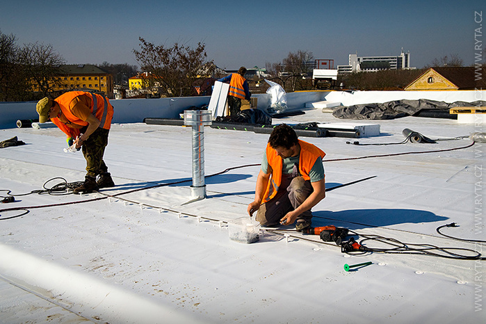 Vrstva tepelné izolace byla prokotvena hmoždinkami v počtu 5 ks/m. V místě atiky byl použit extrudovaný polystyren s OSB deskou a to následně oplechováno poplastovaným plechem zn. Viplanyl. Na skladbu zateplení jsme dále položili geotextilii 300, na kterou jsme provedli montáž vrchní folie Dekplan, která byla v místě spojů nakotvena a svařena.